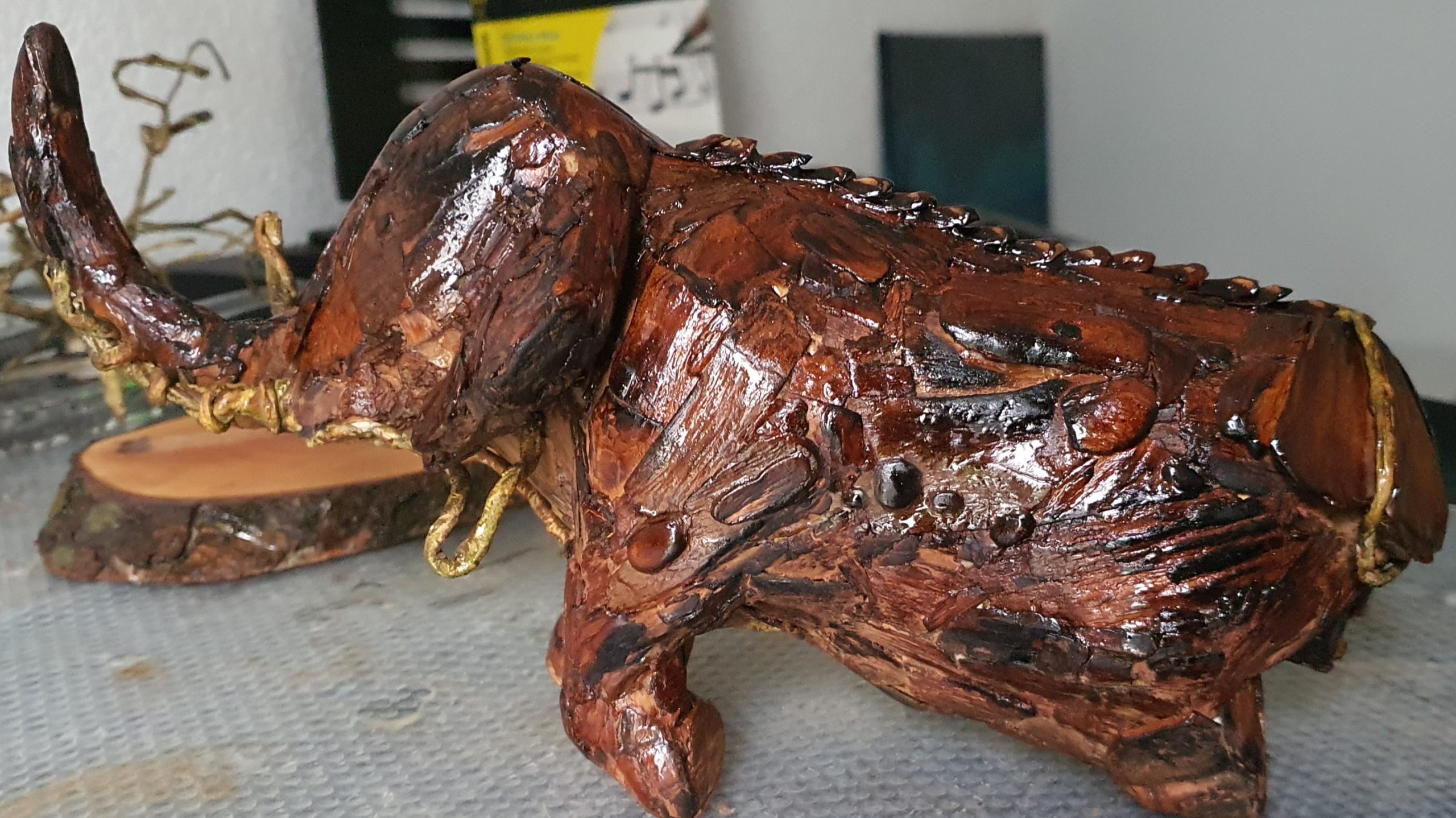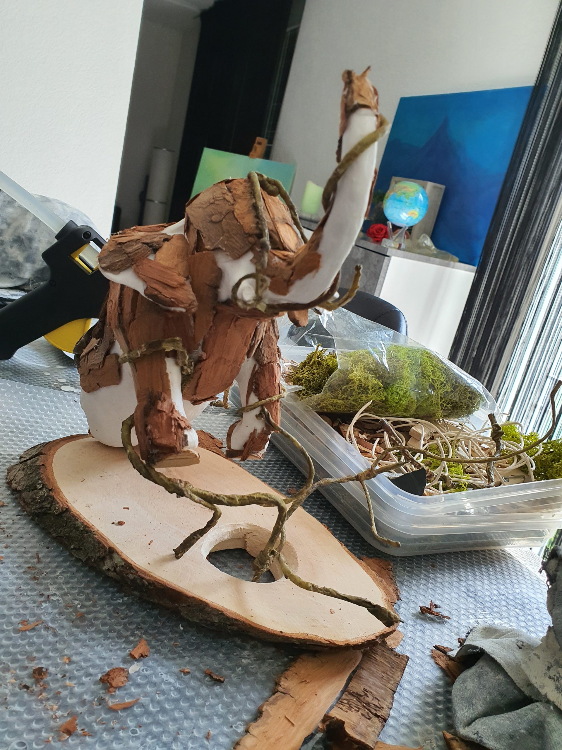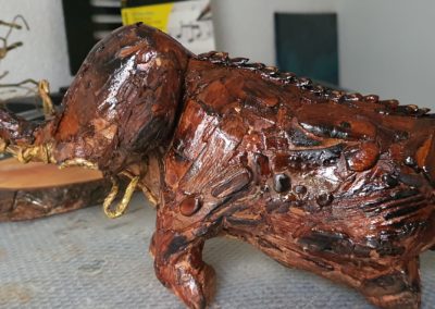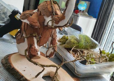 Prozess – Schritt 2: Baumrinde zugeschnitten, vorbereitet und auf der Skulptur befestigt